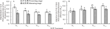 1.3.1 叶绿素荧光参数的测定 在柳枝稷开花期和成熟期, 选一晴天早上的9:00-11:00, 采用FMS-2型便携调制式荧光仪(Hansatech, 英国)测定叶绿素荧光参数, 选取柳枝稷叶片(从上数第2片全展叶)3片, 先测定光适应下的最大荧光(Fm')、初始荧光(Fo')及稳态荧光(Fs), 然后用荧光夹子夹住叶片使其暗反应30 min后, 拉开暗室板, 再用便携式荧光仪对准夹子接口处测定系统直接测定柳枝稷叶片的荧光参数Fo、Fm和Fv, 并计算PSⅡ 最大光化学效率(Fv/Fm)、PSⅡ 实际光化学量子效率(Φ PSⅡ )、PSⅡ 的潜在活性(Fv/Fo)、PSⅡ 的热耗散量子比率(Fo/Fm)及 PSⅡ 最大光化学效率作用光下实际的光化学淬灭系数(qP)和非光化学淬灭系数(NPQ)。其中Φ PSⅡ 反映了与光合作用原初反应中的PSⅡ 的开闭和天线色素分子发射的荧光过程 , Φ PSⅡ =(Fm'- Fs)/Fm'; qP反映了PSⅡ 反应中心的开放程度, qP=(Fm'-Fs)/(Fm'-Fo'); NPQ可以用来表示植物热耗散的能力变化, NPQ=(Fm-Fm')/ Fm'=Fm / Fm'-1。