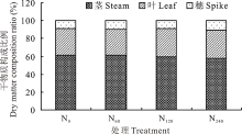 氮素是柳枝稷生长最为重要的营养元素之一。禾本科牧草的生长发育往往依靠植物根系从土壤中吸收的氮素来维持, 但土壤中可利用的氮素通常难以满足禾本科牧草高产优质的需要, 施用氮肥被认为是补充土壤氮素以提高牧草产量的重要手段[23]。大量的研究表明, 氮肥可以显著提高柳枝稷的产量[24, 25], 不同地区柳枝稷施氮效果差异较大, 在美国南部地区氮肥施用量为200 kg· hm-2时柳枝稷产量较高, 在黄土高原半干旱地区施氮量为120 kg· hm-2时柳枝稷干物质产量最高, 过量施氮反而不利于柳枝稷产量的提高[26]。本试验中, 在无氮添加(0 kg· hm-2, N0)、低氮(60 kg· hm-2, N60)、中氮(120 kg· hm-2, N120)和高氮(240 kg· hm-2, N240)4个施肥水平下, 柳枝稷干物质积累量随着施氮水平的增加而显著增加, 其中柳枝稷各生育时期内均在施高氮(240 kg· hm-2, N240)水平下干物质积累量最高, 显著高于其他施氮处理, 这与陶梦等[27]和徐艳霞等[28]研究结果不一致, 可能是由于不同区域的气候、土壤、环境、柳枝稷品种以及水分管理有差异。张永乾[29]研究了宁夏银北地区柳枝稷的生态适应性, 结果表明茎对地上部干物质积累的贡献最大, 平均贡献率为61.35%, 其次是穗, 平均贡献率为24.91%, 最后是叶片, 平均贡献率为13.74%。本研究表明, 柳枝稷地上部干物质积累量的构成中, 茎对地上部干物质积累的贡献最大, 平均贡献率为60.26%, 其次是叶片, 平均贡献率为34.95%, 最后是穗, 平均贡献率为4.79%。这说明施氮促进了植物体的营养生长, 提高了茎叶的产量和比例, 进而提高其地上部干物质积累。