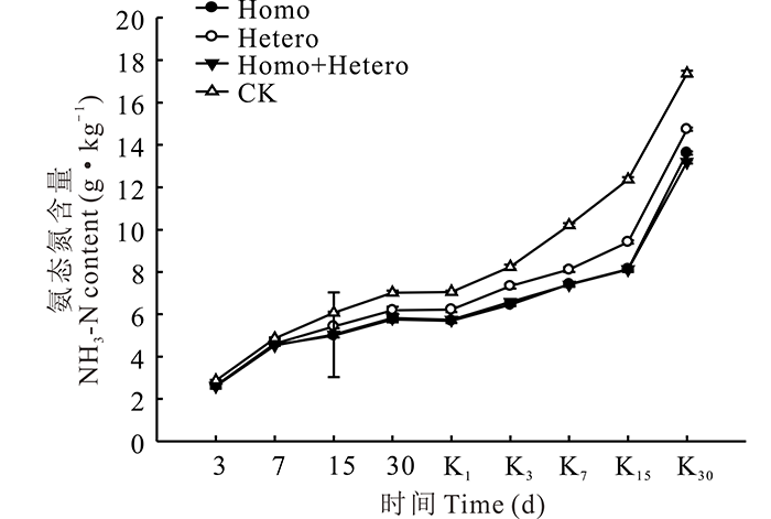 由图1可知, 随着青贮的进行各处理组和对照组的pH均下降, 青贮第3天时除对照组的pH为4.21以外, 各处理组均降至3.8以下; 对照组于第7天时降至3.9, 各处理组和对照组pH自此至青贮第30天一直保持相对稳定, 在整个青贮发酵过程中, 各处理组pH均低于对照组且差异显著(P< 0.05), 但各处理组间无显著差异。有氧暴露后各组pH均有所升高, Homo和Homo+Hetero处理组pH上升较为缓慢, 第30天时分别升至3.84和3.82, Hetero处理组为4.14, 而对照上升最快, 达到4.69, 在整个有氧暴露期间, 各处理组pH均显著低于对照组(P< 0.05), Homo和Homo+Hetero处理组间无显著差异, 均低于Hetero处理组。