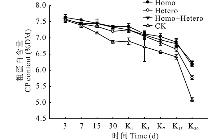 整个青贮期及有氧暴露期, 各处理组和对照组的CP含量均逐渐降低, 且对照组始终低于各处理组(图4), 从青贮第30天开始, 对照组与各处理组差异显著(P< 0.05)。青贮第30天时对照组的CP含量与原料相比损失最多为11.1%, 而Homo和Homo+Hetero处理组损失较少, 分别为4.91%和5.17%。有氧暴露后, 各处理组和对照组的CP含量下降幅度增大, 尤其对照组, 第30天时的CP含量与原料相比损失了36.2%, 与各处理组差异显著(P< 0.05), Homo和Homo+Hetero处理组分别为20.4%和19.2%, CP含量损失较少。