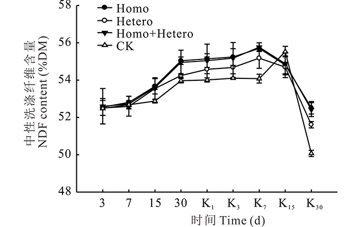 由图5可见, 在青贮过程中, 随着发酵的进行各处理组和对照组的NDF含量均逐渐增加, 有氧暴露后, 继续缓慢增加, 直至第7天达到最高, 之后又大幅下降。有氧暴露15 d后, 青贮饲料中霉菌的数量急剧增加, NDF含量下降可能与霉菌的大量繁殖及其产生的纤维素酶有关。在整个青贮及有氧暴露期间, Homo和Homo+Hetero处理组的NDF含量始终较高, 对照组最低。