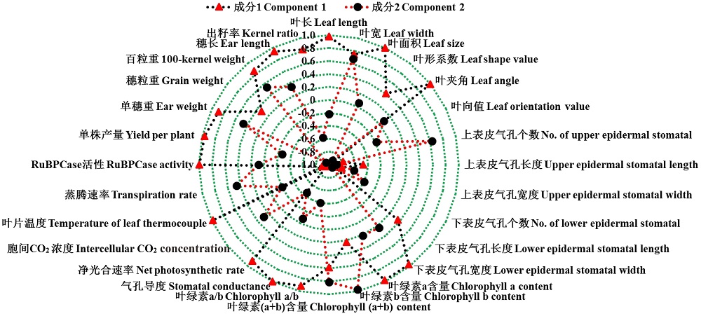 花期3份不同株型基因型在2种水旱处理下对其穗位叶的6个株型性状、6个上/下表皮气孔性状、4个生理性状、6个光合特性及6个产量性状进行分析处理, 计算各性状的耐旱系数。对这些性状的耐旱系数进行PCA主成分分析表明, 从主成分分析的初始化特征值和因子提取后的特征值可知, 28个主成分中前2个主成分的特征值均大于1, 且累计贡献率达到了100%(表3)。说明, 前两个主成分能代表28个性状的全部信息。因此, 可以用这28个性状对3份不同株型玉米的耐旱性进行概括。其中决定第一主成分的主要是叶长、叶面积、叶夹角、下表皮气孔宽度、叶绿素a含量、叶绿素a/b、气孔导度、净光合速率、叶片温度、RuBPCase活性、单株产量、单穗重、百粒重、穗长、出籽率, 可以概括为株型因子、气孔因子、生理代谢因子、光合因子及产量因子, 解释70.53%的贡献率; 决定第二主成分的主要包括叶绿素b及叶绿素(a+b)含量, 可以概括为生理代谢因子, 解释29.47%的贡献率(图5和图6)。