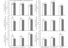 1.3.3 叶绿素 参照Lichtenthaler等[22]的方法, 即用5 mL 95%的乙醇避光浸泡每一处理下3份基因型植株穗位叶中部0.1 g至叶片发白为止, 然后稀释10倍, 在665和649 nm下测定吸光值, 再按照公式计算叶绿素a、b(chlorophyll a and b, Chl a and Chl b)的浓度(Chl a=13.95× A665-6.88× A649, Chl b=24.96× A649-7.32× A655)和含量(Chl a and b content, Chl a/Chl b含量=Chl a/Chl b浓度× 提取液体积× 稀释倍数/样品鲜重/1000), 并计算总叶绿素含量[chlorophyll (a+b) content, Chl (a+b)]。类囊体的垛叠程度用叶绿素a/b(chlorophyll a/b, Chl a/b)进行估测[23]。