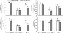 正常供水处理, 3份不同株型基因型花期穗位叶的叶绿素a、b、a+b含量及叶绿素a/b间差异显著(P< 0.01或P< 0.05), 这4个性状均表现为廊黄> TS141> 昌7-2(图3)。说明, 不同株型基因型的叶绿素含量间差异明显, 其可能是不同株型玉米叶绿素合成酶活性及叶绿素合成速率不同引起的。花期缺水处理, 紧凑株型廊黄、昌7-2穗位叶的叶绿素a、b、(a+b)含量均降低(P> 0.05), 而平展株型TS141的这3个性状均显著降低(P< 0.01或P< 0.05)(图3)。此外, 花期廊黄和昌7-2在缺水处理下穗位叶的叶绿素a/b均升高(P> 0.05), 而TS141的叶绿素a/b显著降低(P< 0.05)(图3)。说明, 缺水能抑制不同株型玉米叶绿素合成酶活性及叶绿素合成速率, 或能加速叶绿素降解酶活性及叶绿素降解速率。与平展株型玉米相比, 干旱胁迫对紧凑株型玉米的这4个性状的影响程度更小。