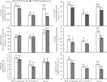 1.3.4 光合特性 采用美国LI-6400/XT便携式光合仪测定每一处理下3份基因型植株穗位叶中部的气孔导度(stomatal conductance, Gs)、净光合速率(net photosynthetic rate, Pn)、胞间CO2浓度(intercellular CO2 concentration, Ci)、叶片温度(temperature of leaf thermocouple, Tl)和蒸腾速率(transpiration rate, Tr)。具体测定时间选在晴天上午的9:00-11:00进行, 光合有效辐射(photosynthetic active radiation, PAR)设为1000 μ mol· m-2· s-1, CO2浓度设为环境浓度。参照徐芬芬等[23]的方法估测叶肉细胞核酮糖1, 5-二磷酸羧化酶活性(RuBPCase activity, RuBPCase; RuBPCase=Pn/Ci× 100%)。