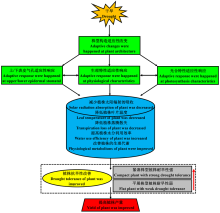 Improvement of plant architecture is an important way to fully exploit the potential of environmental resources of light, heat, and water in maize ( Zea mays) production, and it is the basis of breeding targeting ideal plant type. This research studied the response mechanisms of drought tolerance related to plant architecture in maize. The plant architecture traits, stomatal morphologies, physiological metabolisms and photosynthesis characteristics of ear leaf, and yield were recorded for three different maize genotypes (Langhuang, Chang7-2, and TS141) with differing plant architecture under drought stress during the flowering stage. It was found that: 1) Leaf length, leaf width, leaf size, and leaf angle were decreased significantly, and leaf shape value and leaf orientation value of the three maize genotypes were increased significantly under drought stress. Moreover, genotype TS141, characterized as ‘flat’, had larger changes of these six plant architecture traits than genotypes characterized as ‘compact’ (Langhuang and Chang 7-2); 2) Drought stress increased the numbers of upper and lower epidermal stomata of all three maize genotypes, but decreased stomatal length and width. The change in stomatal number of TS141 was greater than for the other cultivars, and the size reduction was smaller; 3) Chlorophyll a, b, and (a+b) contents, and chlorophyll a:b ratio of TS141 were significantly decreased by drought. For the tested genotypes, chlorophyll a:b ratio had a smaller increase, and the other three traits had a smaller decrease in Langhuang and Chang 7-2 after drought stress than in TS141; 4) Stomatal conductance, net photosynthetic rate, the temperature of leaf thermocouples, transpiration rate, and RuBPCase activity decreased to different degrees in different genotypes, and intercellular CO2 concentration increased to different degrees in the three tested maize genotypes under drought stress. However, compared with TS141, Langhuang and Chang 7-2 had smaller changes; 5) Yield per plant, ear weight, grain weight, 1000-seed weight, ear length, and kernel ratio of all three maize genotypes were decreased significantly under drought stress, and TS141 was affected more severely than Langhuang and Chang 7-2; 6) Principal component analysis and a heat map with hierarchical cluster analysis indicated that the relationships among these traits in maize under drought stress were complex and interrelated with each other, and could completely account for the differences in drought tolerance between the different plant architecture genotypes. Therefore, it is deduced from these results that plant architecture may be an important drought regulator that can be co-regulated with stomatal morphologies, physiological metabolisms, and photosynthetic characteristics to form the response mechanisms of drought tolerance. Moreover, because 'compact' maize genotypes displayed stronger drought tolerance, these types have better drought tolerance potential for use in future breeding work.
