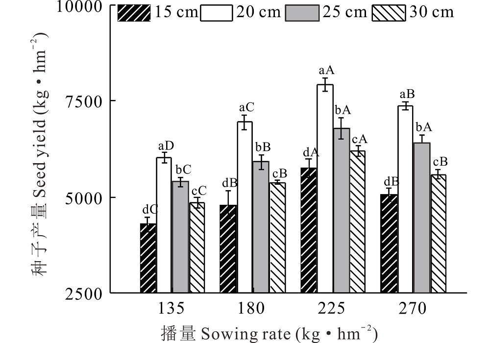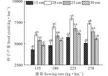 | 图1 不同播量和行距下燕麦的种子产量变化Fig.1 The change of seed yield of oat under different sowing rate and row spacing |
