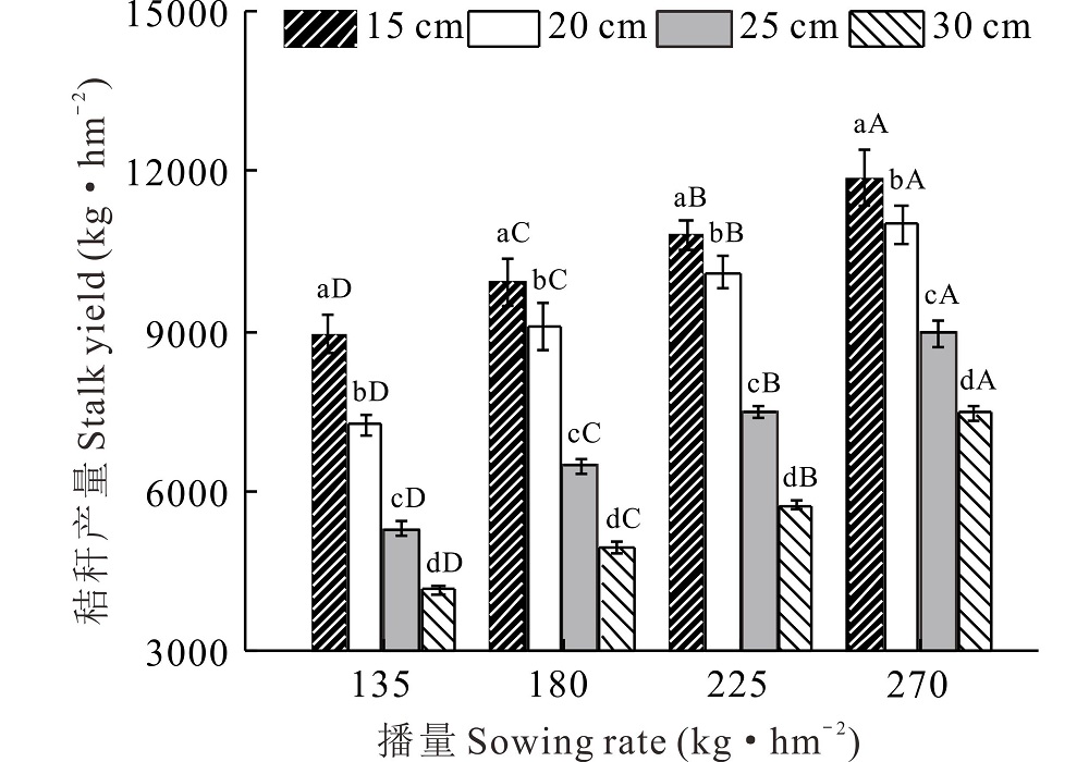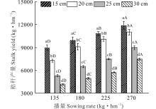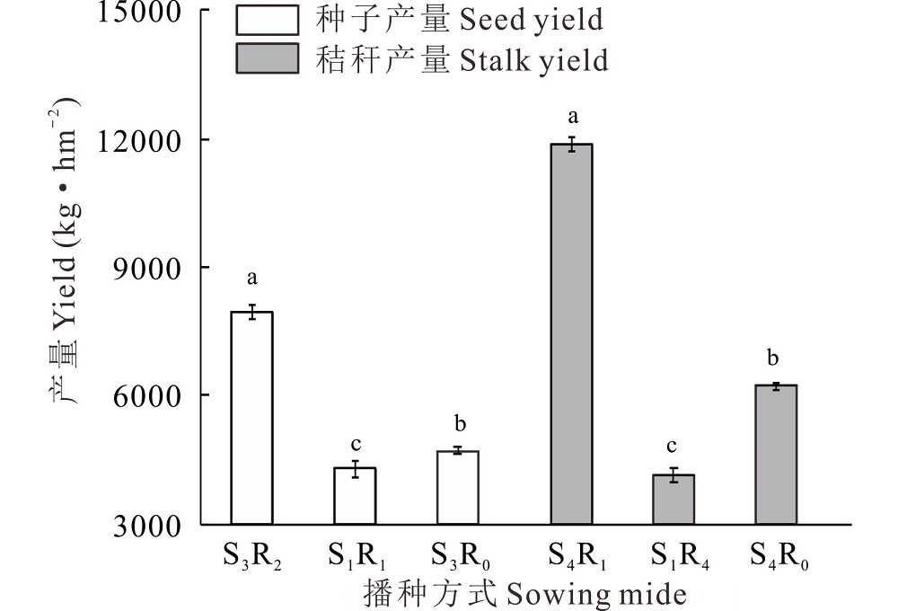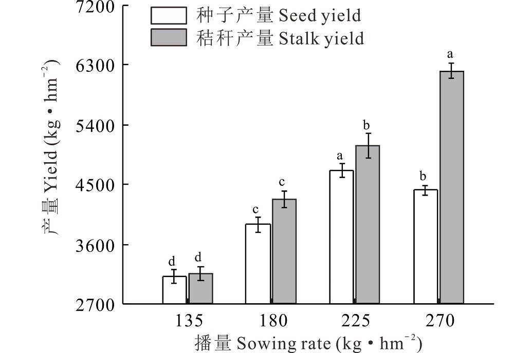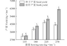 | 图3 不同播量下撒播对燕麦种子及秸秆产量的影响Fig.3 Effect of broadcast sowing on seed yield and stalk yield under different sowing rate |