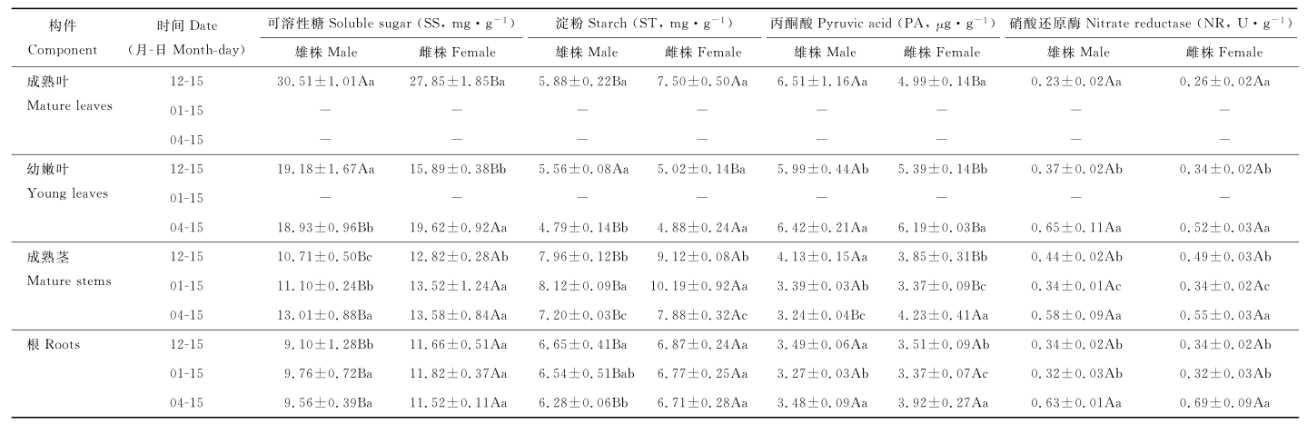 1.3.1 生理代谢 于越冬前(2017年12月15日)、越冬中(2018年1月15日)和越冬后(2018年4月15日), 随机选择雌雄株各3株, 分别取青绿的成熟叶和幼嫩叶各10片(没有绿叶则不测定), 取2 cm长的成熟茎和根各10段, 剪碎混合均匀备用。构件样品各称量0.2 g, 用苏州科铭生物有限公司生产的试剂盒, 分别测定与计算可溶性糖(SS)、淀粉(ST)、丙酮酸(PA)含量和硝酸还原酶(NR)活性[17], 3次重复。