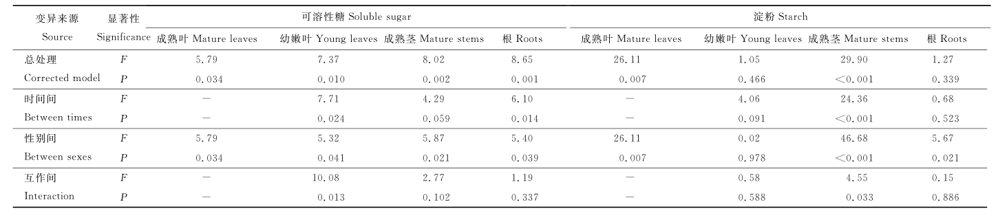 | 表 3 雌雄株构件可溶性糖和淀粉含量的双因子方差分析 Table 3 Two-factor variance analysis about SS and ST content in components of male and female plants 。。 |