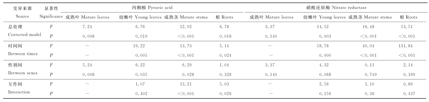 | 表 4 雌雄株构件中丙酮酸含量和硝酸还原酶活性的双因子方差分析 Table 4 Two-factor variance analysis about PA and NR content in components of male and female plants |
