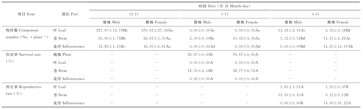 1.3.2 存活率和再生情况 存活率:越冬前和越冬中, 随机选雌雄株各6株, 测单株的茎、叶、花序数。越冬后以新茎叶形成为植株存活依据, 随机选存活雌雄株各6株, 测存活构件数, 计算:植株存活率=存活植株数/越冬前植株数× 100%, 构件存活率=存活构件数/越冬前构件数× 100%, 构件再生率=再生构件数/越冬前构件数× 100%。