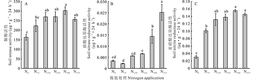 土壤脲酶的活性随施氮量的增加呈现先增后减的趋势。当施氮量为300 kg· hm-2时脲酶活性达到最大, 在N375处理中脲酶活性下降(图1A)。土壤中硝酸还原酶的活性随着施氮量的增加而显著增强, 并在N375处理硝酸还原酶活性最大, 为0.251 μ g· g-1· 24 h-1。与对照相比增加了641.00%(图1B)。与对照相比施氮显著增加了土壤亚硝酸还原酶的活性。当施氮量为300 kg· hm-2时亚硝酸还原酶活性达到最大。施氮处理亚硝酸还原酶活性高于不施氮处理(图1C)。