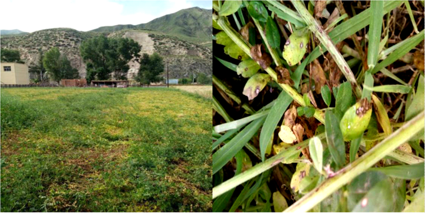 箭筈豌豆炭疽病于7月中旬开始发生, 病情指数为8.45; 8月中旬达到高峰期, 发病率为56.3%, 病情指数为15.88。主要危害箭筈豌豆叶片和茎秆, 发病初期, 在叶片和茎秆上出现圆形、椭圆形的黑褐色小斑点, 后期扩展为黑褐色圆形病斑, 病斑中央则由黑褐色变为灰白色。病斑上产生轮纹状的小黑点, 病斑可形成穿孔, 病叶易脱落。发病严重时大量植株变黄最后枯死(图1)。