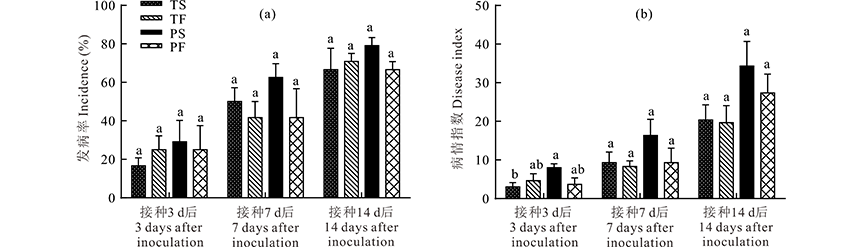 致病性测定试验在兰州大学草地农业科技学院智能温室进行。选取健康饱满的箭筈豌豆(兰箭2号)种子200粒, 分别经75%酒精处理3 min, 1%次氯酸钠消毒10 min, 再用无菌水冲洗5次后均匀摆放于铺有灭菌滤纸的无菌培养皿(直径90 mm)中, 滴加5 mL无菌水, 每天注意加水保湿。在恒温培养箱里黑暗培养72 h后, 挑选无污染的幼苗用于试验。盆栽用土先过筛(孔径2 mm)剔除杂物, 平铺在瓷盘上约3 cm厚, 将瓷盘放置在烘箱中, 169 ℃下灭菌2 h, 降温后装在塑料大桶中, 盖上桶盖备用。每次称取灭菌土壤1000 g, 装在15 cm(上口径)× 11 cm(下口径)× 14 cm(高)、底部铺两层滤纸的塑料花盆中用以种植植物。将箭筈豌豆幼苗移栽于花盆中, 每盆8株。采用涂抹刺伤法(TS)、涂抹非刺伤法(TF)、喷雾刺伤法(PS)和喷雾非刺伤法(PF)4种接种方法, 将配制好的1× 106个· mL-1孢子悬浮液接种到12盆箭筈豌豆植株上, 每盆接种量为200 mL, 并用接无菌水作为对照[21], 共16盆。黑暗保湿48 h。接种3、7和14 d后调查植株的发病情况。调查方法如1.1。