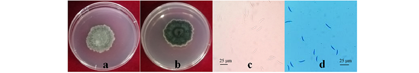| 图4 箭筈豌豆炭疽病菌在PDA培养基上的形态学特征 a, b: 在PDA上的菌落特征; c, d: 分生孢子特征。Fig.4 Morphological features of pathogen on PDA a, b: Upper colony morphology on PDA; c, d: Conidia. |