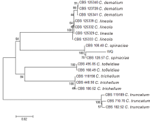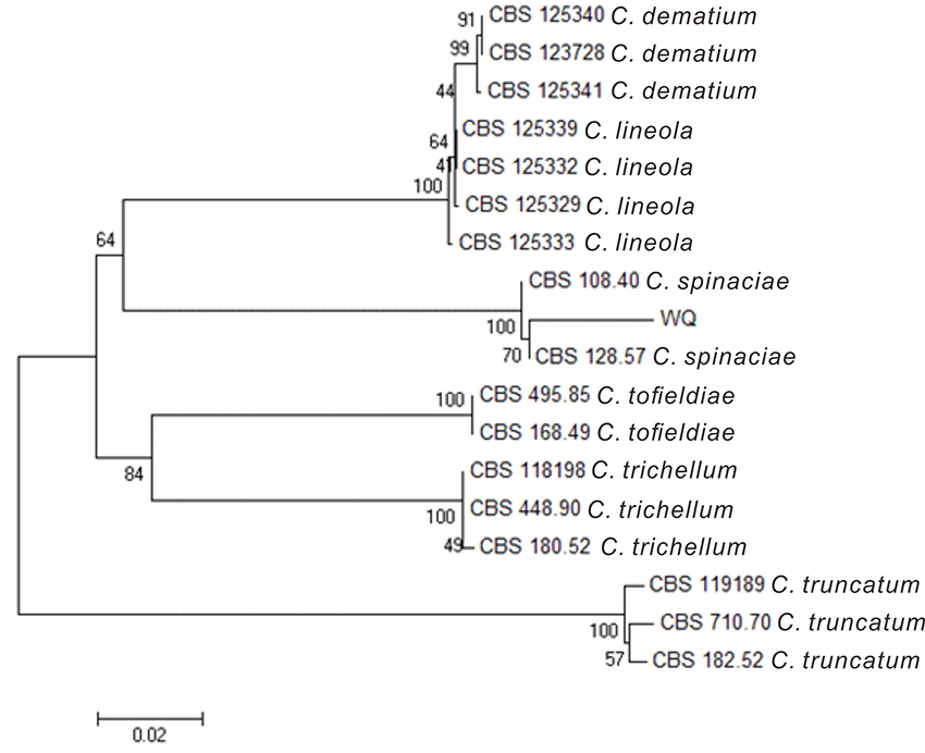 2.3.2 分子生物学鉴定 将菌株WQ的ITS、ACT、CHS1和GAPDH基因序列上传至GenBank数据库, 得到的登录号为MK402144、MK387713、MK387714和MK387715。BLAST后发现菌株CHS1和GAPDH基因序列与登录号为GU228337.1和GU228239.1的菠菜炭疽菌相似性达100%, ITS基因序列与登录号为GU227847.1菠菜炭疽菌的相似性达99%, ACT基因序列与登录号为GU227945.1菠菜炭疽菌的相似性达98%。系统发育树分析结果表明, 菌株WQ与编号为CBS 128.57菠菜炭疽菌同源性最高, 在70%水平上聚为一支(图5)。结合箭筈豌豆炭疽病病原菌形态特征, 根据多基因序列分析结果, 将箭筈豌豆炭疽病病原菌确定为菠菜炭疽菌。