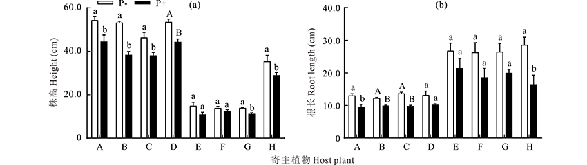 2.4.2 生长指标 试验结果表明, 接种菠菜炭疽菌(P+)后, 兰箭1号、兰箭2号、兰箭3号、红豆草和燕麦的株高均显著低于未接菌处理(P-)植株(P< 0.05)。接菌处理下, 333/A的株高较对照降低了17.2%(P< 0.01), 而苜蓿和三叶草的株高在接菌和不接菌下无显著差异(P> 0.05)(图6a)。兰箭1号和燕麦的根长在接菌和不接菌下存在显著性差异(P< 0.05), 接菌后分别降低了27.2%和42.5%。兰箭2号和兰箭3号植株受到菠菜炭疽菌侵染后, 其根长均极显著降低(P< 0.01), 而其他寄主植物的根长并未受显著影响(P> 0.05)(图6b)。