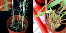 Xu等[21]发现甘肃庆阳市的箭筈豌豆炭疽病可危害植物叶片、茎和荚, 发病初期, 在新叶上形成圆形褐色斑点。在个别小叶上可能存在一个或多个病斑, 一半甚至整个小叶都受到侵染。病害发生严重时, 叶片变黄, 有许多浅棕色至棕褐色坏死斑点, 边缘较暗。茎和叶柄上的病变最初是黑色线性的, 后来逐渐扩大并且经常与相邻病斑聚结, 直到侵染大部分茎秆。
