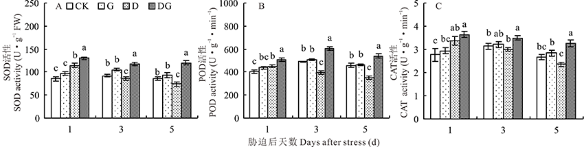 1.3.2 抗氧化酶活性测定 超氧化物歧化酶(SOD)活性采用氮蓝四唑(nitro-blue tetrazolium, NBT)还原法测定[12], 过氧化物酶(POD)活性采用愈创木酚法测定[13], 过氧化氢酶(CAT)采用高俊凤[14]的方法测定。