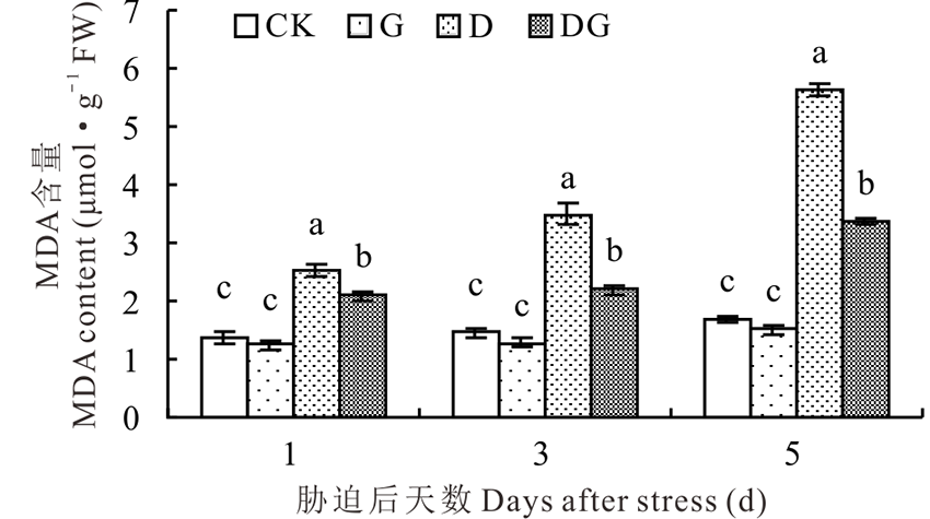 丙二醛(MDA)是膜脂过氧化的产物, 过量积累对细胞膜具有损害作用。随着胁迫天数的增加, 叶片MDA含量逐渐升高。正常条件下, 外源施用GABA对MDA含量没有显著影响(图3)。干旱胁迫导致叶片内MDA含量显著升高, 与对照及G处理相比差异显著。施用外源GABA会显著降低干旱胁迫下叶片内MDA含量, 在胁迫后的1、3和5 d, DG处理的MDA含量分别是D处理的0.82、0.63和0.60倍(图3)。