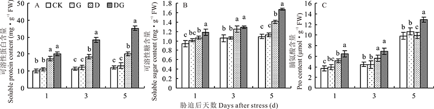 可溶性糖作为植物的营养成分, 其含量变化可以反映植物的生长状态。图6B显示, 与对照相比, G处理可溶性糖含量没有显著变化。在干旱胁迫条件下, 随着处理时间的增加, D处理的可溶性糖含量逐渐增加, 而外源喷施GABA使叶片可溶性糖含量进一步增加, 与D处理相比, DG处理在胁迫后的1、3、5 d叶片可溶性糖含量分别增加11.72%、3.45%和19.08%。