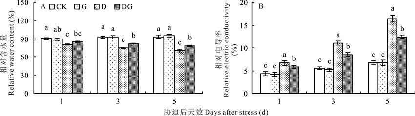 叶片的相对电导率可以判断细胞膜受伤害的程度。由图7B可知, 随着处理时间的增加, 叶片的相对电导率呈现逐渐增加的趋势, 但是G处理和CK相比差异不显著。干旱胁迫下, 叶片的相对电导率显著增加, 外源喷施GABA可以降低叶片的相对电导率, 在处理的第1、3、5天, 与D处理相比, DG处理的叶片相对电导率分别降低14.95%、29.49%和32.21%, 差异显著。