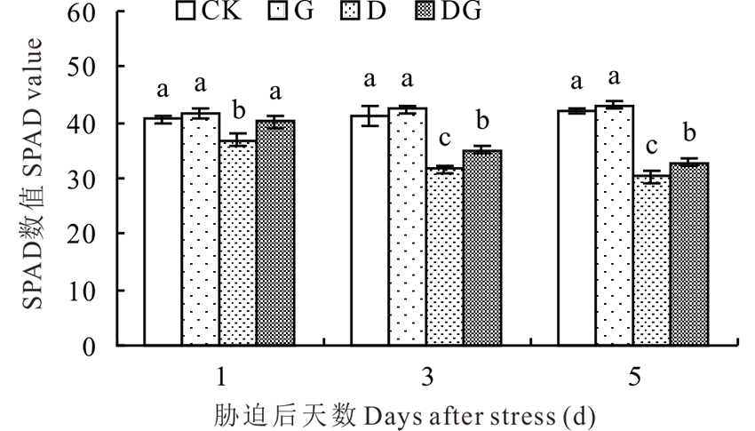 叶绿素是光合作用的物质基础, 负责光能的捕获、传递、分配和转化等过程, 其含量变化能够反映光合作用的强弱, 而SPAD数值的大小能直接反映出叶绿素含量的多少。如图8所示, 随着胁迫天数增加, 对照和G处理的SPAD值呈小幅上升的趋势, D和DG处理呈现逐渐下降的趋势。G处理SPAD数值与对照相比在所有取样天数差异不显著, 这表明正常生长条件下施用外源GABA对叶绿素含量无明显影响。干旱胁迫会导致SPAD数值显著降低, 外源施用GABA能显著提高叶片SPAD数值, 与D处理相比, DG处理在胁迫后1、3和5 d叶片SPAD数值分别升高8.97%、10.73%和8.25%。