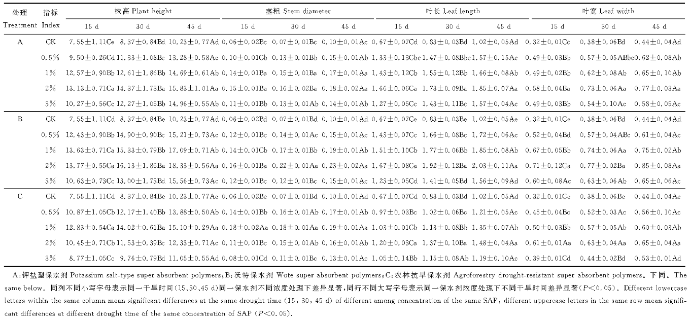 | 表2 不同用量保水剂处理对白刺花叶片生长指标的影响 Table 2 Effects of SAP of different dosages on growth indexes of S. davidi leaf (cm) |